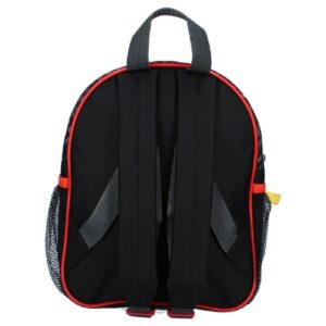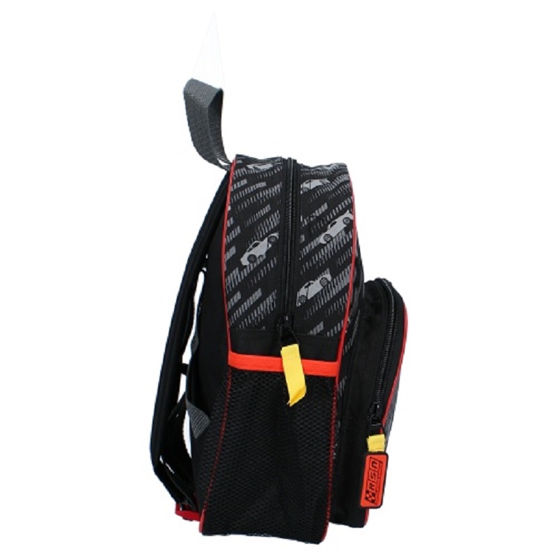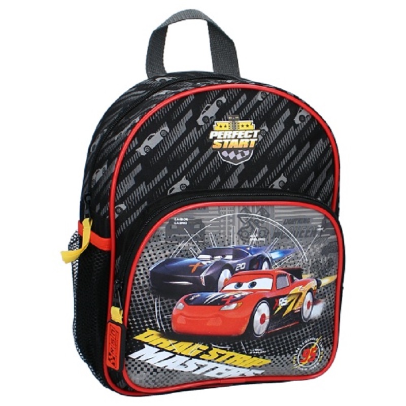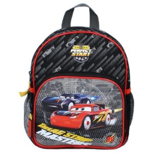 Kids Disney Cars backpack. Size 29 x 23 x 9 cm approx. Colour black. Main compartment & front compartment with zip opening. Grab handle on top. Adjustable back straps. Mesh compartment on side of backpack.