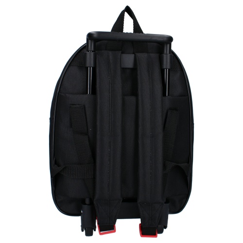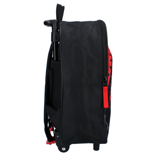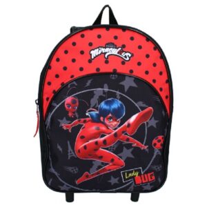 Miraculous Ladybug backpack. Girls Miraculous Ladybug travel bag. Colour black. Size 33 x 25 x 10 cm. Main compartment with zip opening. Adjustable back strap. Can use on shoulder as a backpack. With wheels and legs to stand. Extendable pull handle. Grab handle on top.
