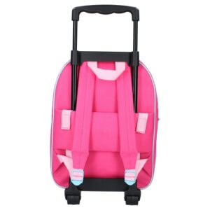 Girls Disney Princess trolley backpack. Colour pink. Size 38 x 28 x 16 cm approx. Extendable pull handle for easy transport. Large and front compartment with zip opening. 2 wheels at the bottom. Adjustable back straps to use on shoulder.
