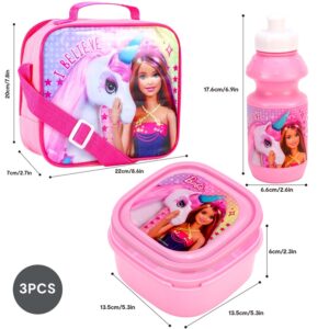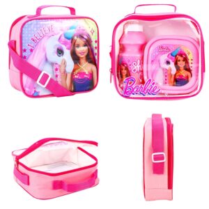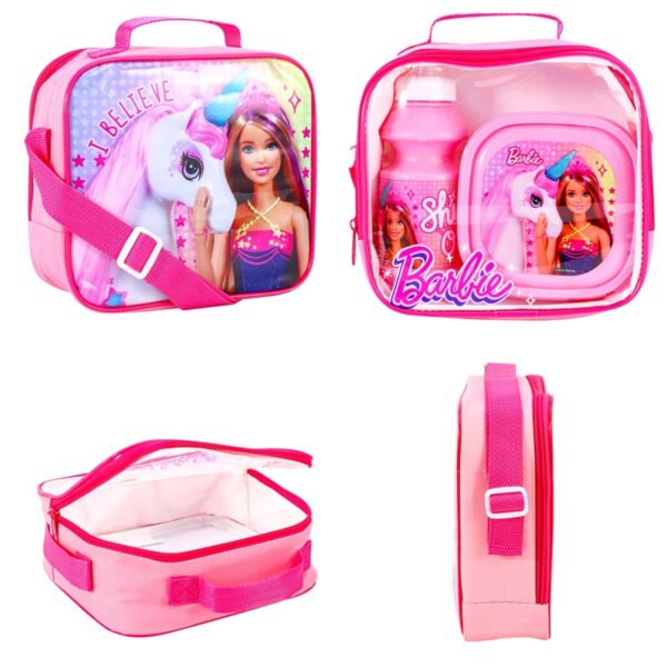 Barbie lunch bag set. Girls Barbie lunch bag, bottle & sandwich box set. Adjustable shoulder strap & grab handle on lunch bag. Bottle holds approx 350 ml. Size of lunch bag 22 x 20 x 7 cm approx. One size of lunch bag is glossy Barbie picture and other side is transparent. Zip opening lunch bag.