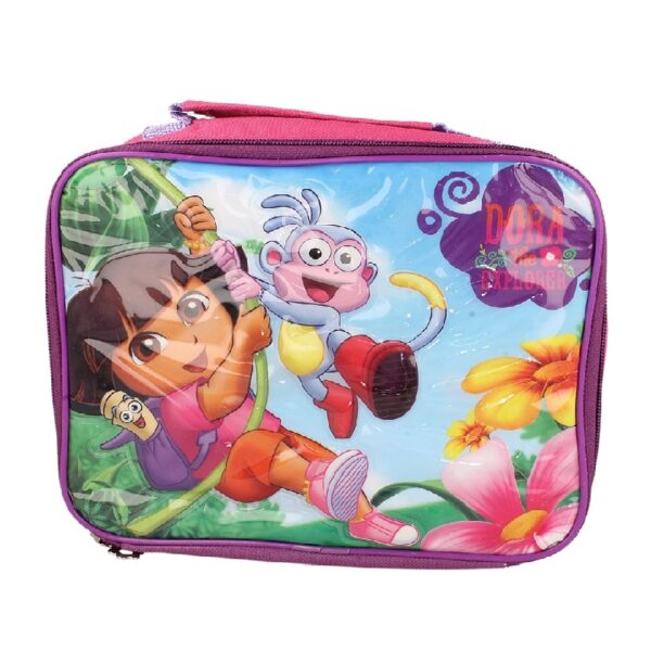 Kids Dora The Explorer lunch bag. Colour purple. Zip opening. Grab handle. Ideal for school. Size approx 20 x 24 x 8 cm.