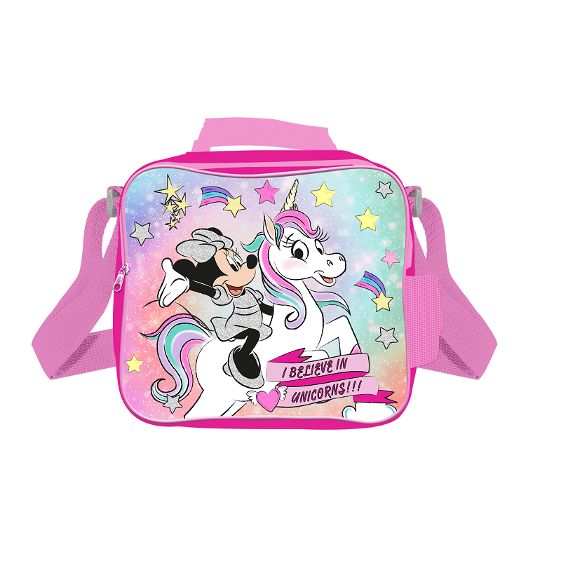 Minnie Mouse lunch bag. Kids Disney Minnie Mouse lunch bag. Each lunch bag features a main zipped cooler compartment for keeping your food fresh. as well as carry handle, shoulder strap and side netting for a water bottle. Size 21 x 19 x 8 cm approx.