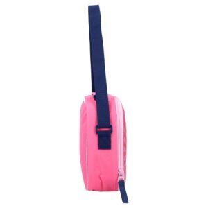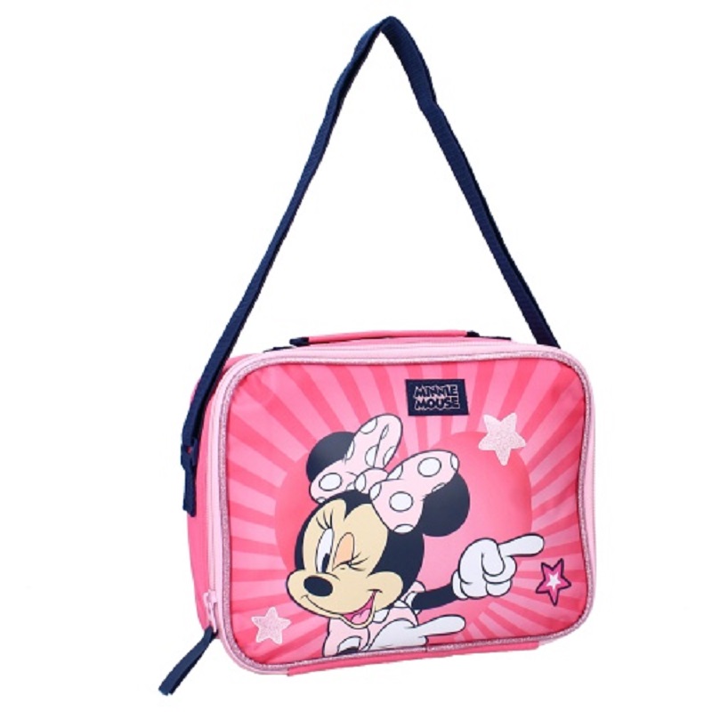 Minnie Mouse lunch bag. Kids Minnie Mouse lunch bag. Adjustable shoulder strap & grab handle on lunch bag. One size of lunch bag is glossy Minnie Mouse picture. Zip opening.