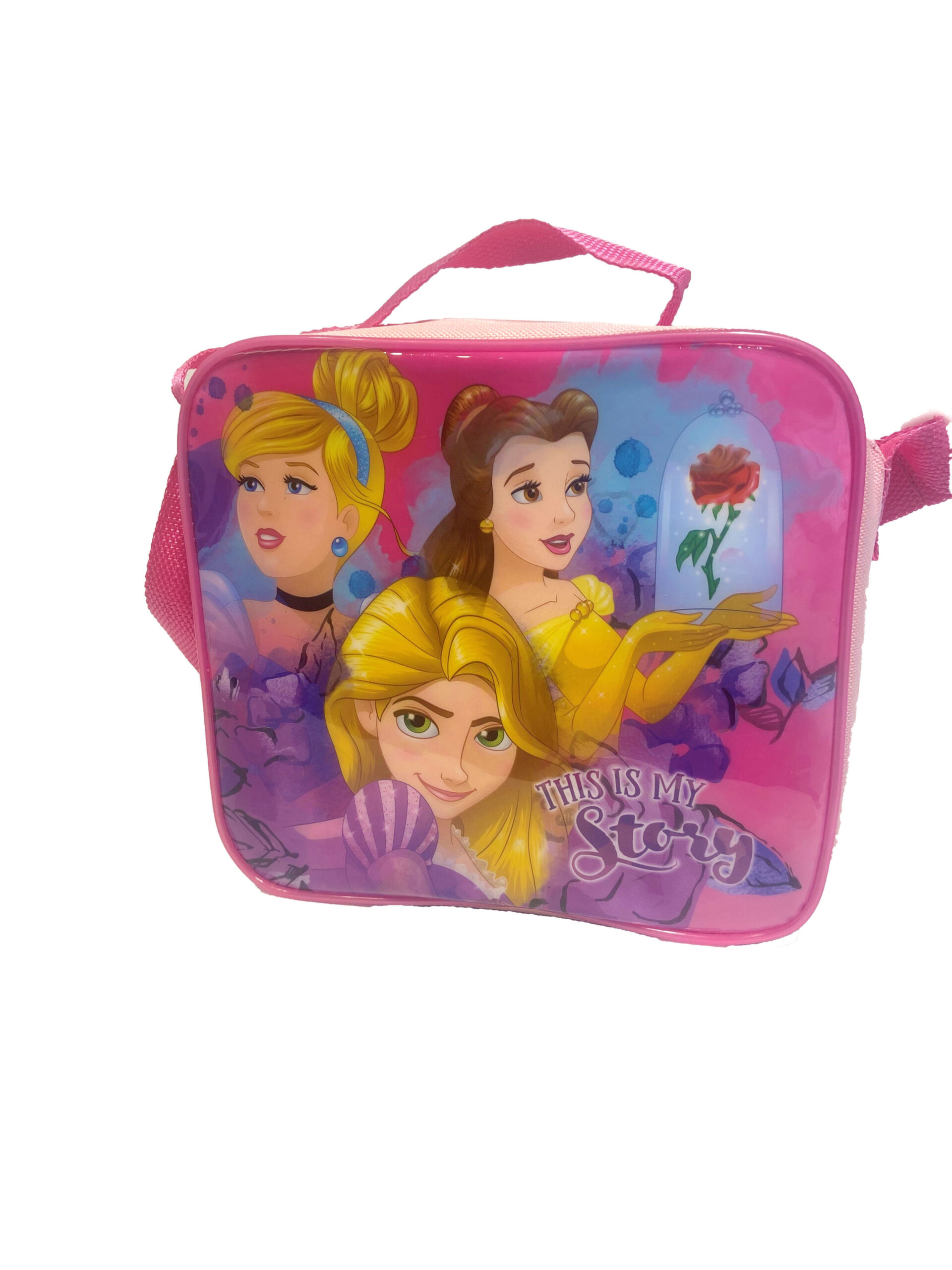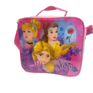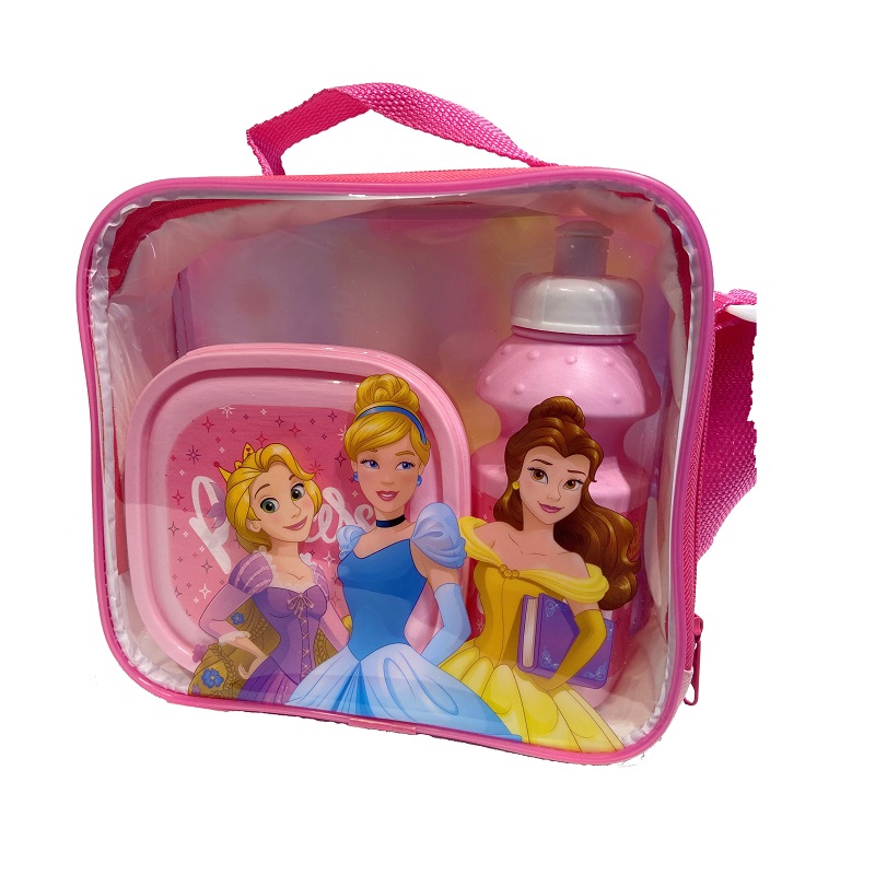 Princess lunch bag set. Girls Disney Princess lunch bag, bottle & sandwich box set. Adjustable shoulder strap & grab handle on lunch bag. Bottle holds approx 350 ml. Size of lunch bag 24 x 20 x 7 cm approx. One size of lunch bag is glossy Princess picture and other side is transparent. Zip opening lunch bag.