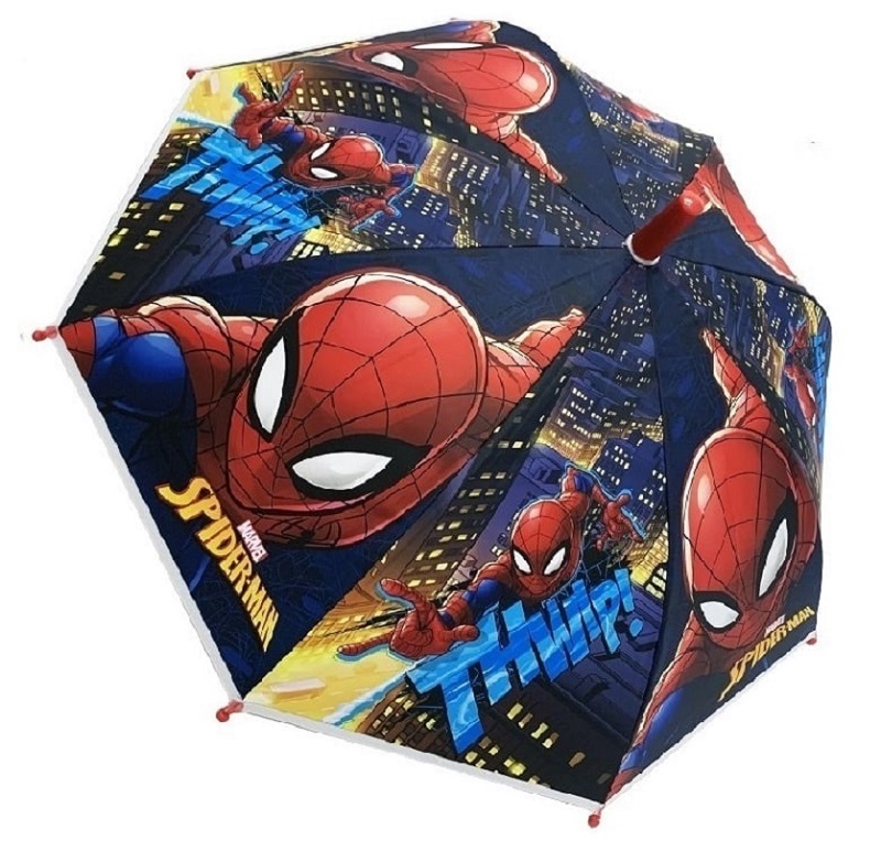 A tough umbrella for a tough guy. With this navy blue Spider-Man umbrella your son sneaks out of the house. Nothing stops him from catching the bad guys, not even the rain. Spider-Man keeps an eye on top of the umbrella. The umbrella has the colours of the superhero: blue and red. Your son easily holds the umbrella on the round handle. To prevent your little man from hurting himself on the umbrella, there are round caps at the bottom of the boning supports. Size 63 x 70 x 70 cm.