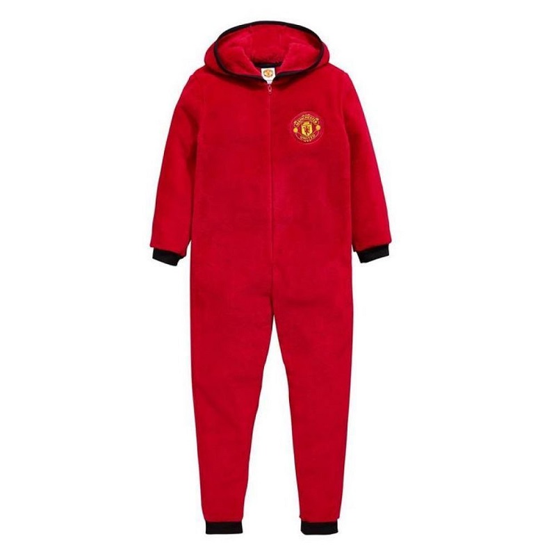 Man United onesie. Official licence product. Colour red. Material soft fleece polyester. Long sleeve. Front zip opening. With hood. Kids cosy sleepwear.