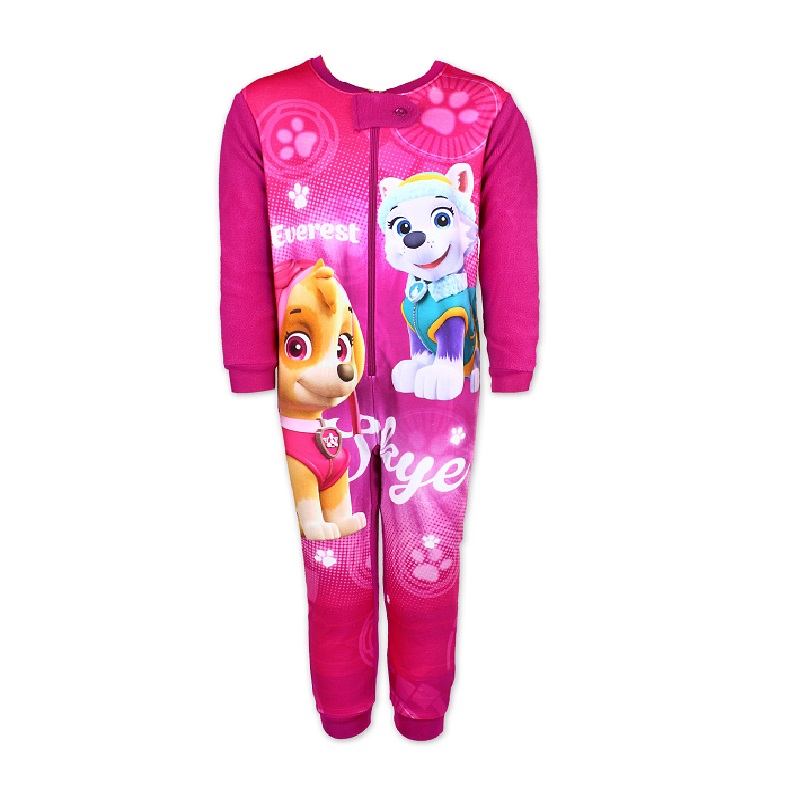 Paw Patrol onesie. Girls Paw Patrol all in one nightwear. Front zip opening. Colour pink. Age 3-8 years. Front sublimation print and back plain. Material fleece polyester.